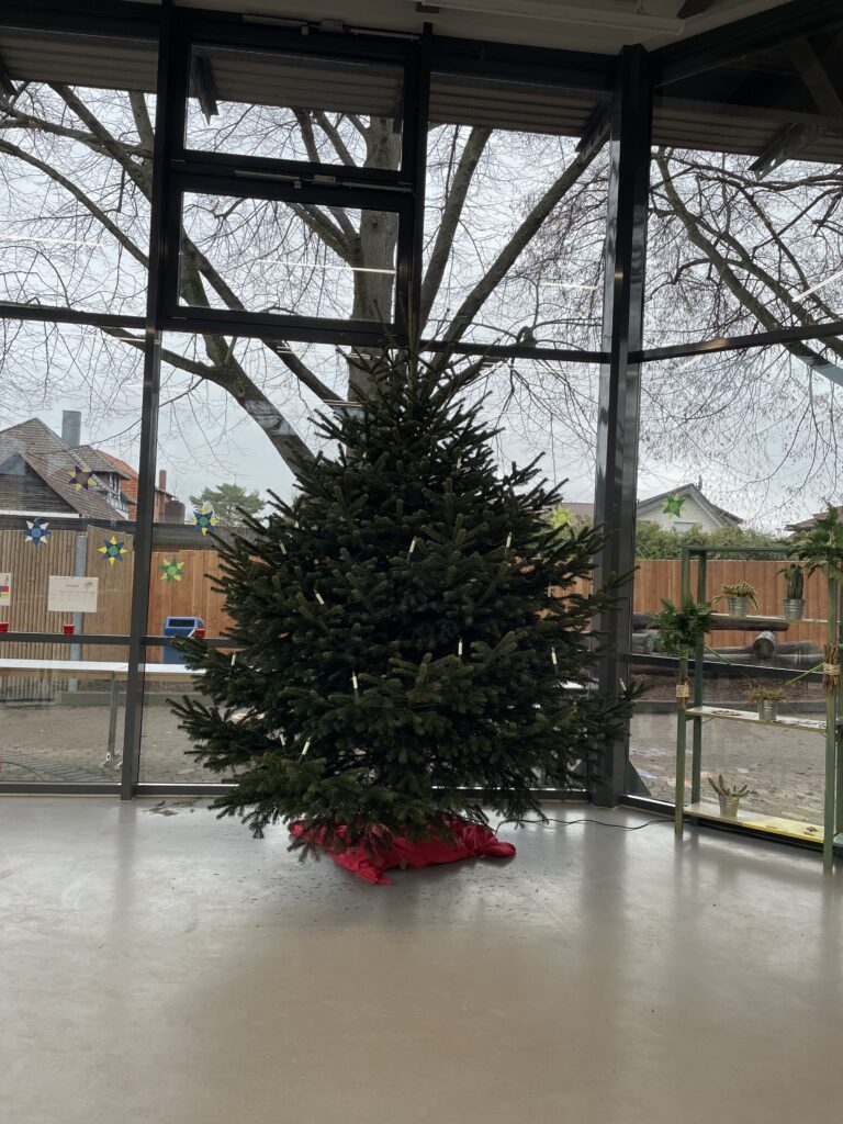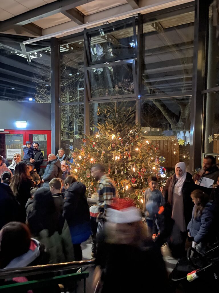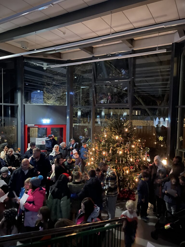 Zum gemeinsamen Abschluss traf sich die gesamte Schulgemeinschaft in der Pausenhalle. Als Frau Richter die Lichterkette einschaltete, erstrahlte der Weihnachtsbaum im warmen Licht und gemeinsam stimmten alle das Weihnachtslied „Oh Tannenbaum“ an.
