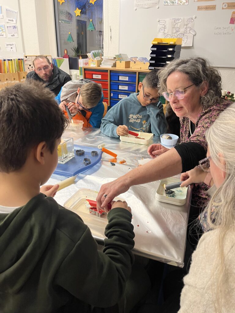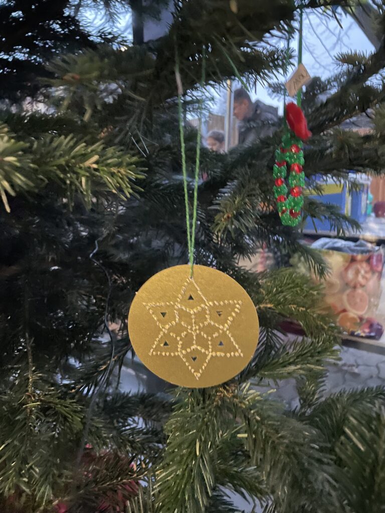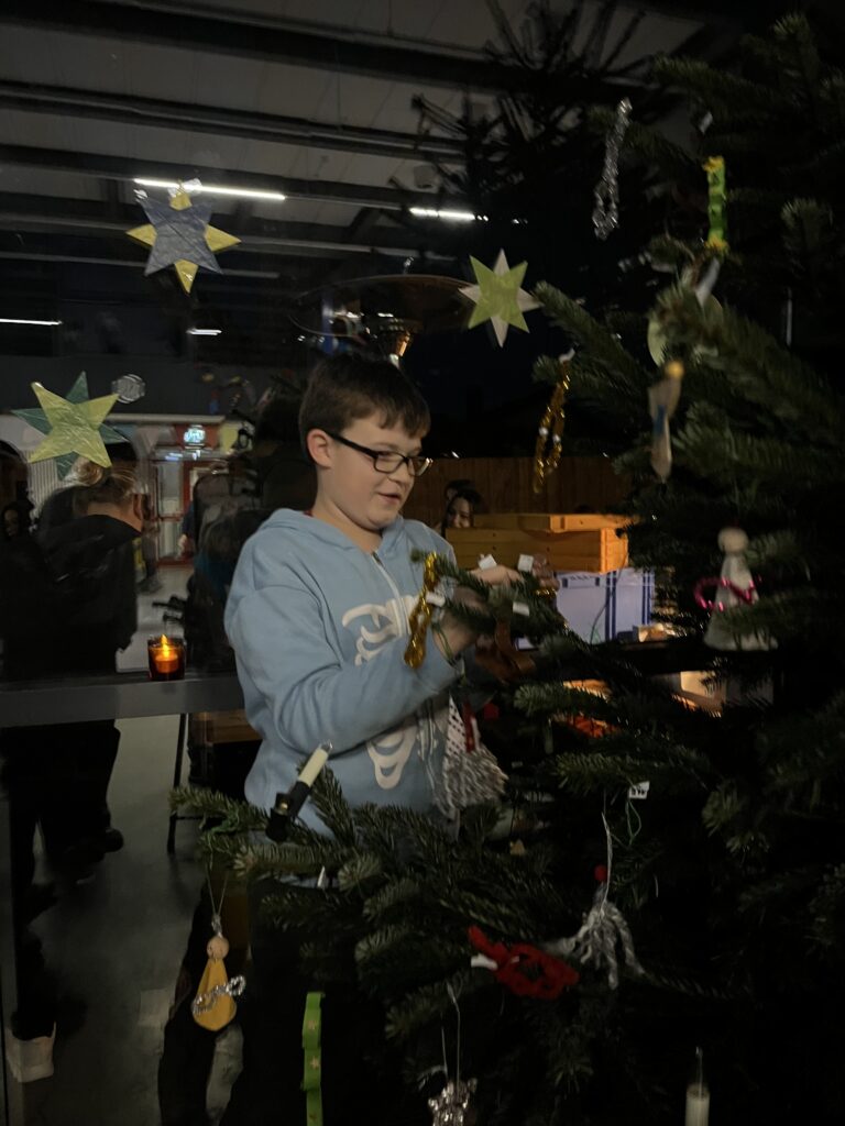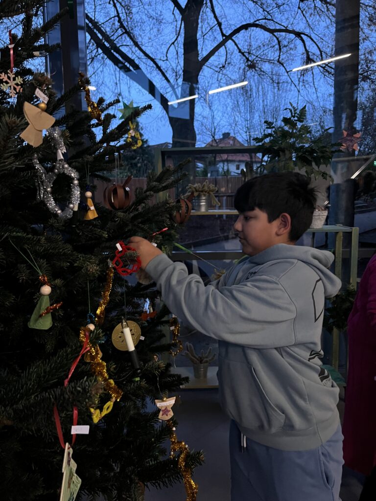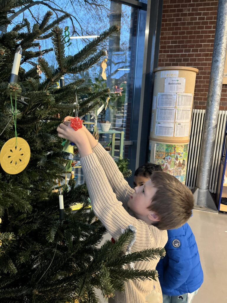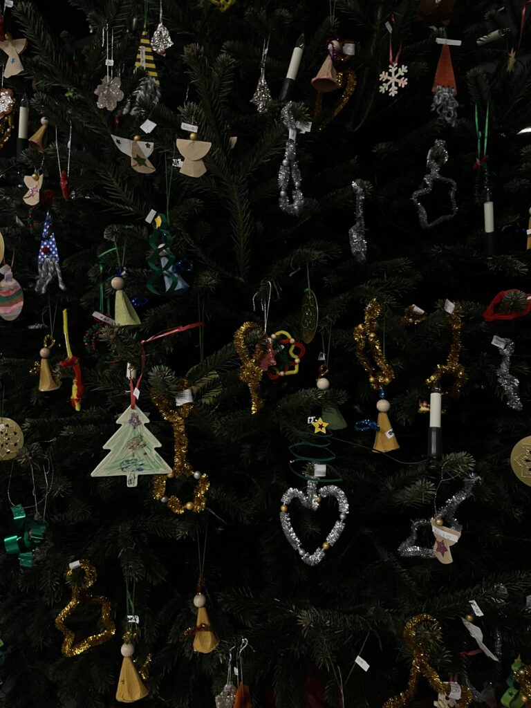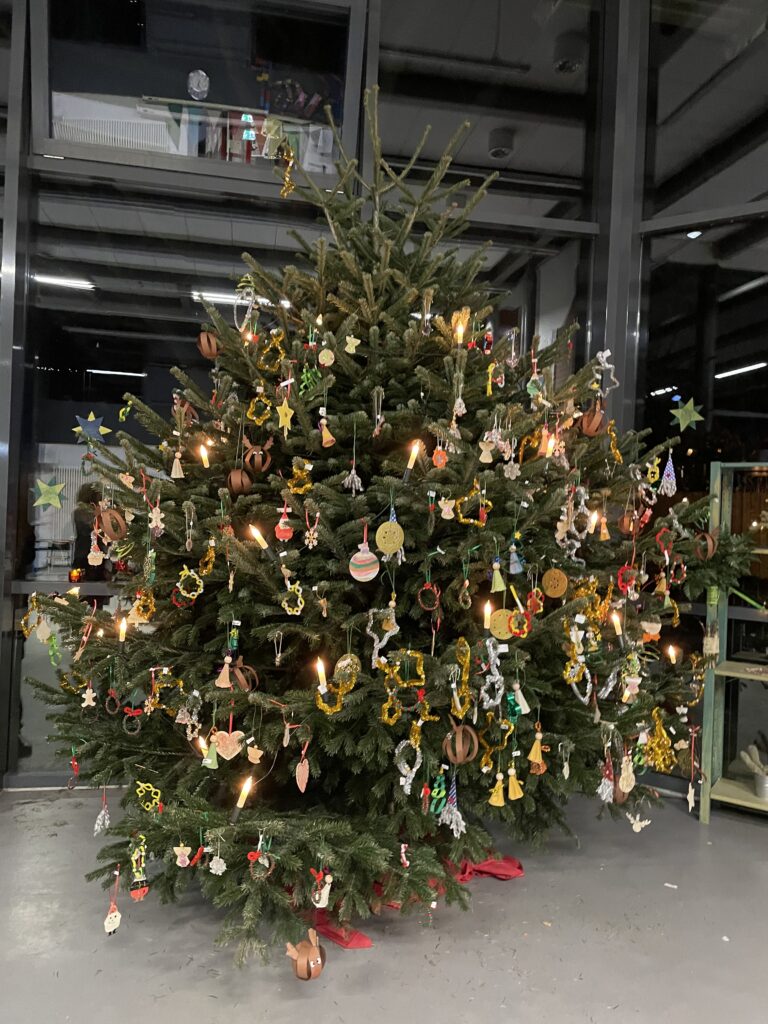 In den Klassenräumen wurde fleißig gebastelt. Die Kinder gestalteten gemeinsam mit ihren Eltern kreative Weihnachtsanhänger, die anschließend unseren großen Tannenbaum in der Eingangshalle schmückten. Dieser wurde im Laufe des Nachmittags immer bunter und festlicher.