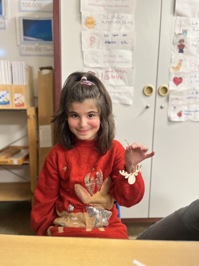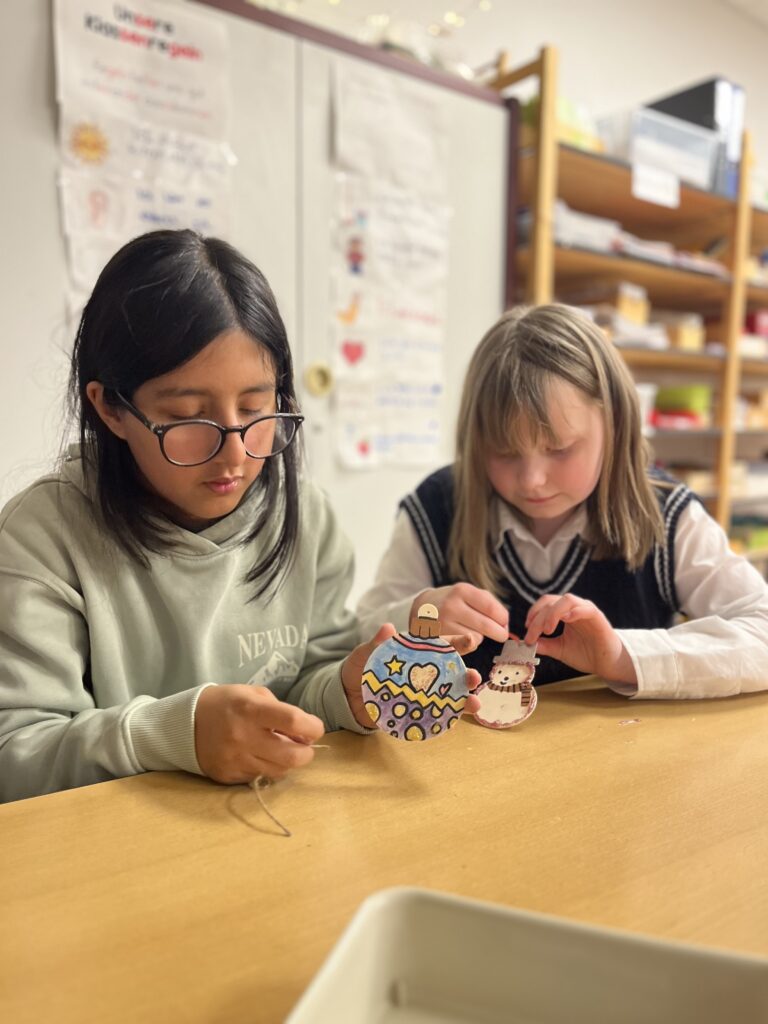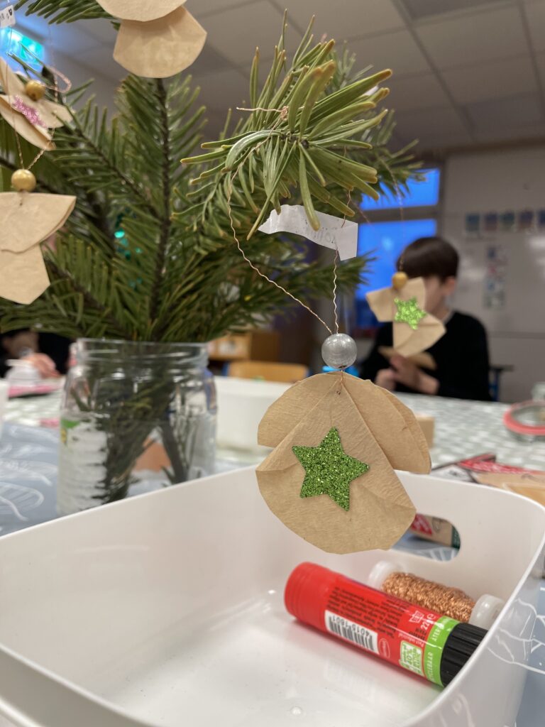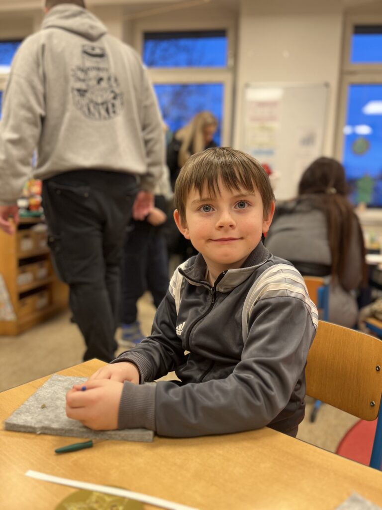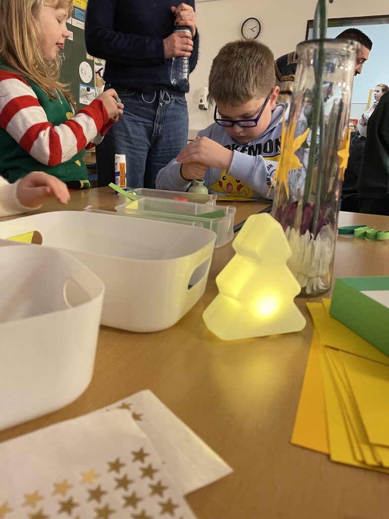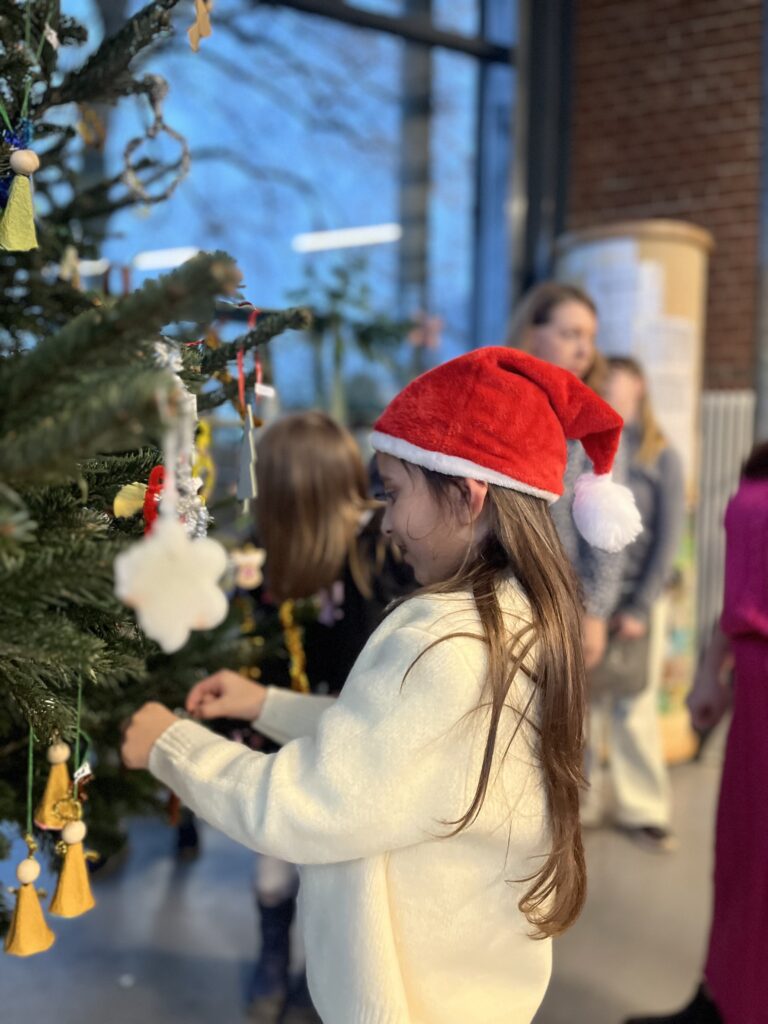 In den Klassenräumen wurde fleißig gebastelt. Die Kinder gestalteten gemeinsam mit ihren Eltern kreative Weihnachtsanhänger, die anschließend unseren großen Tannenbaum in der Eingangshalle schmückten. Dieser wurde im Laufe des Nachmittags immer bunter und festlicher.