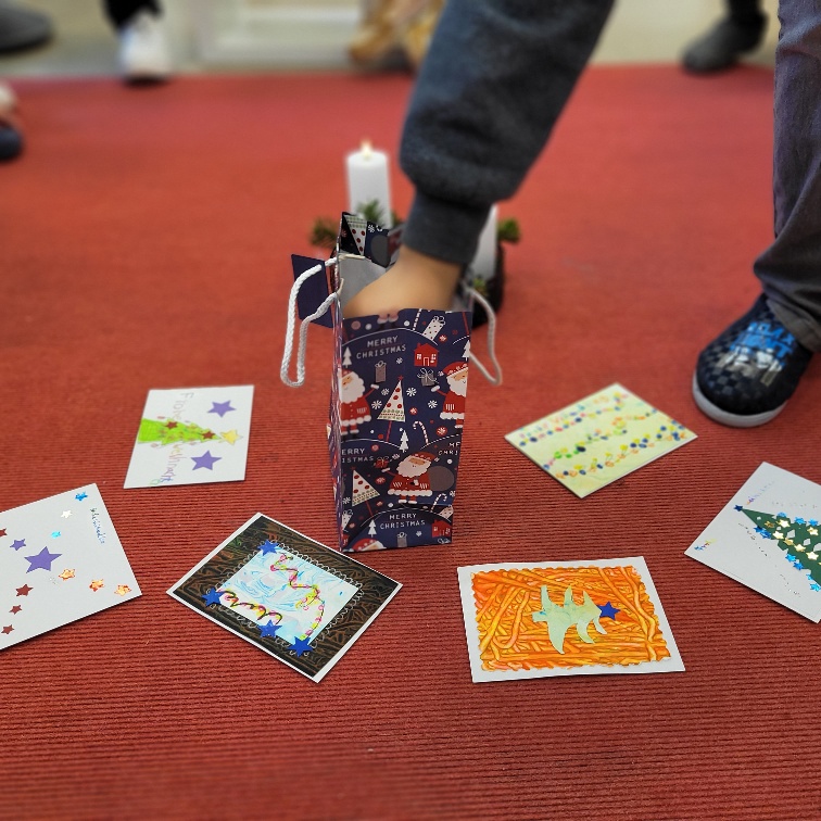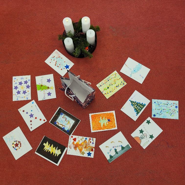 Jedes Kind durfte eine Karte aus dem Wichtelsack ziehen, die Karte vorstellen und dann auch vorlesen. Bevor nun jedes Kind seine Weihnachtsgrüße mit nach Hause nehmen darf, schmücken sie vorerst den Klassenraum. Und wer weiß, vielleicht verlässt erneut ein Briefpaket die Schule in Richtung Hessen.