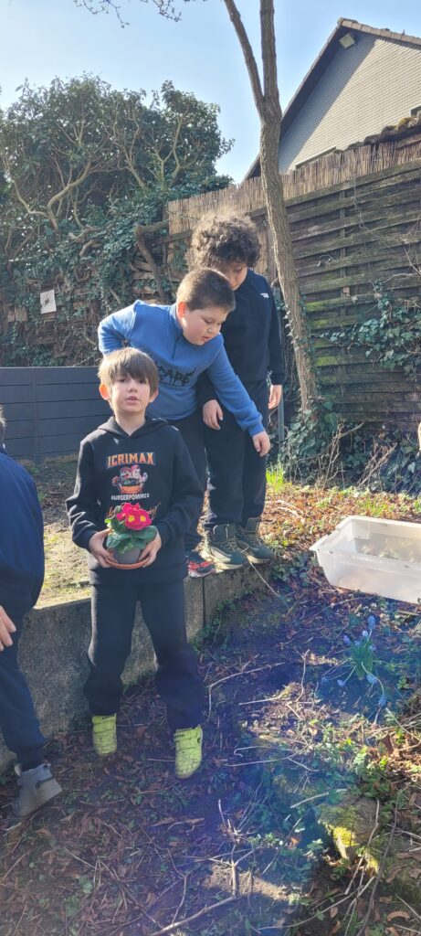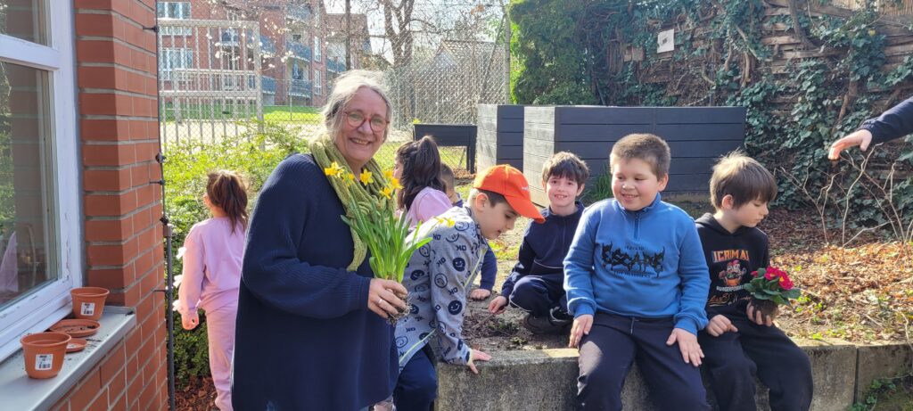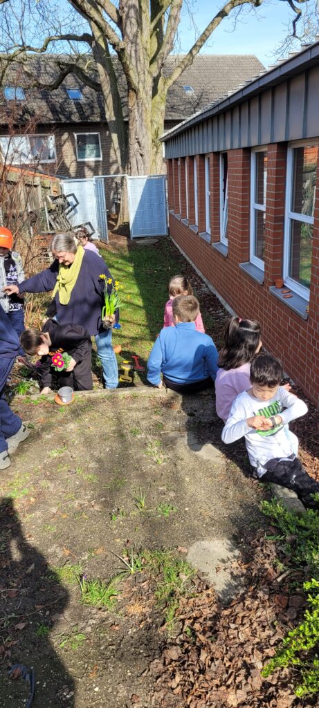 Nachdem sich die Klasse 1b fächerübergreifend mit Frühblühern beschäftigt hat, wurden am letzten Tag vor den Osterferien Perlhyazinthen, Osterglocken und Primeln eingepflanzt!